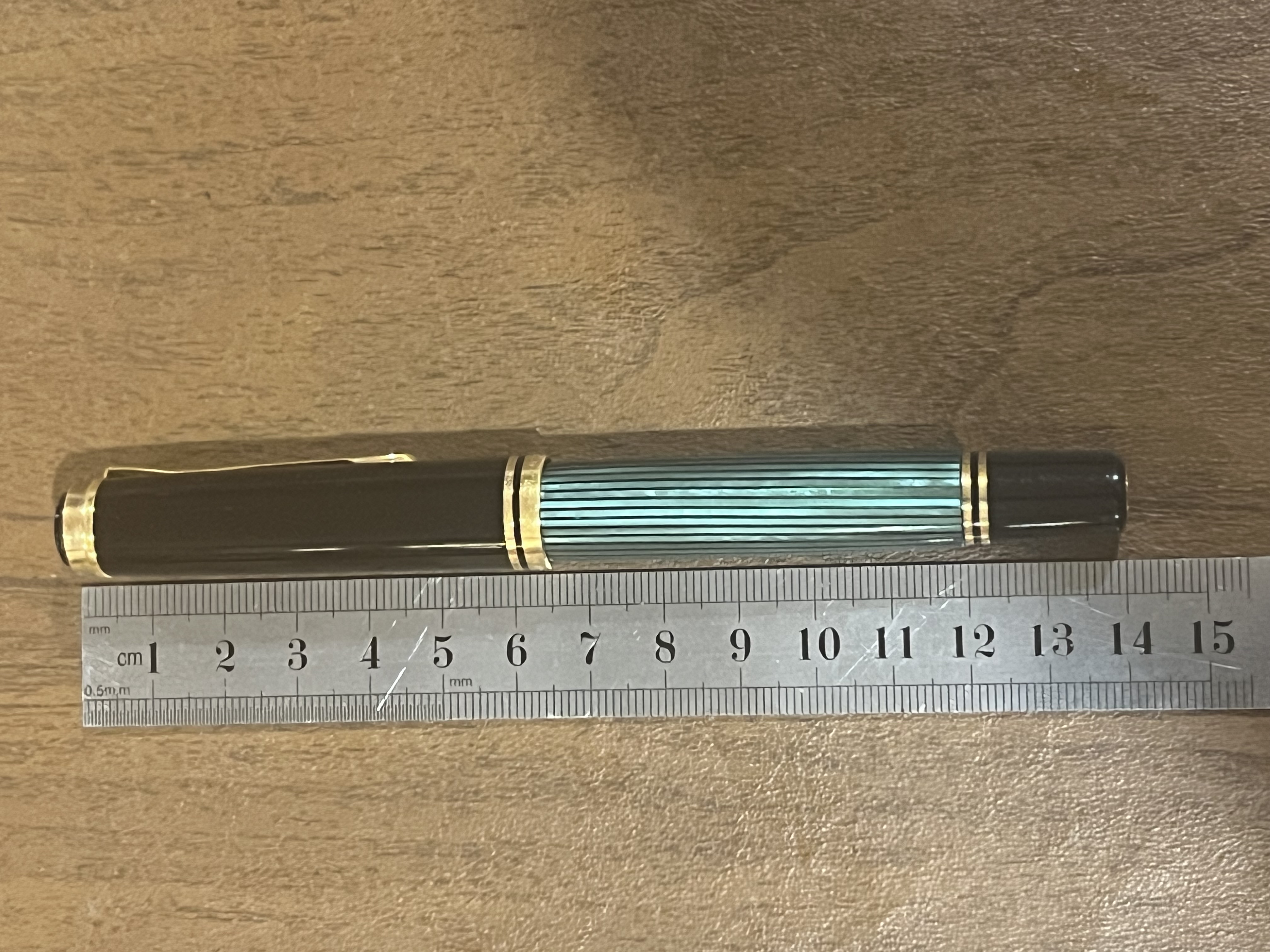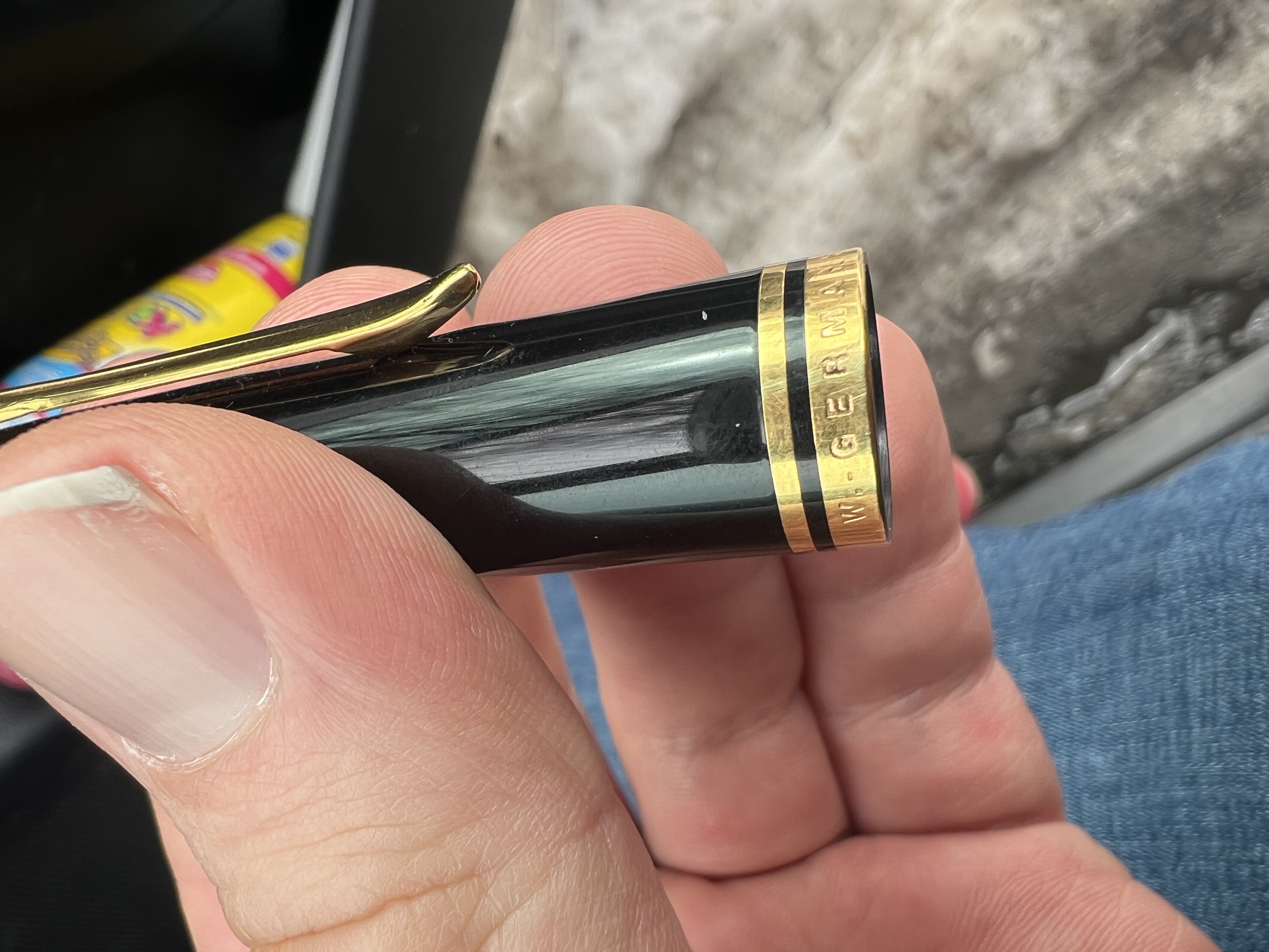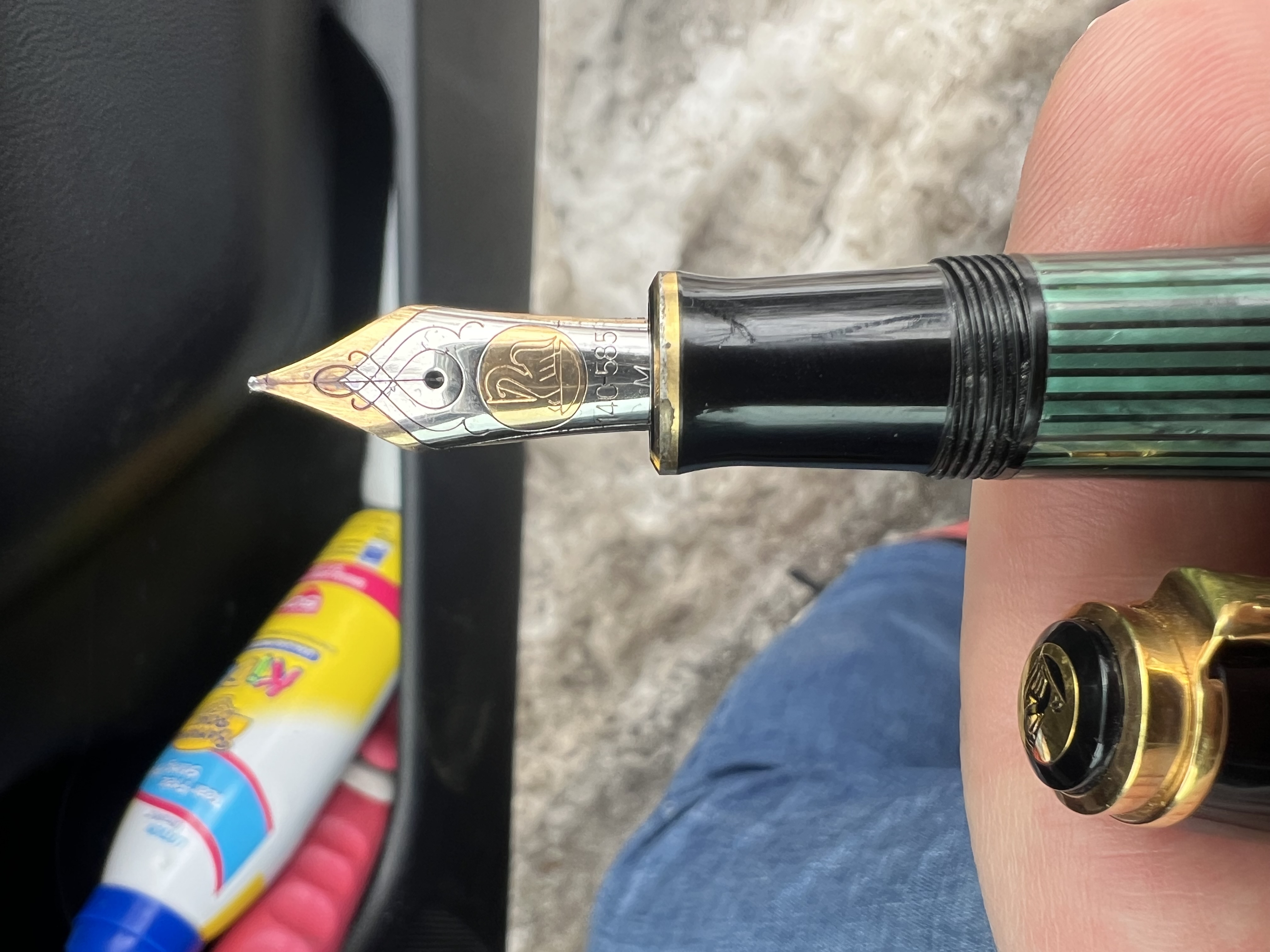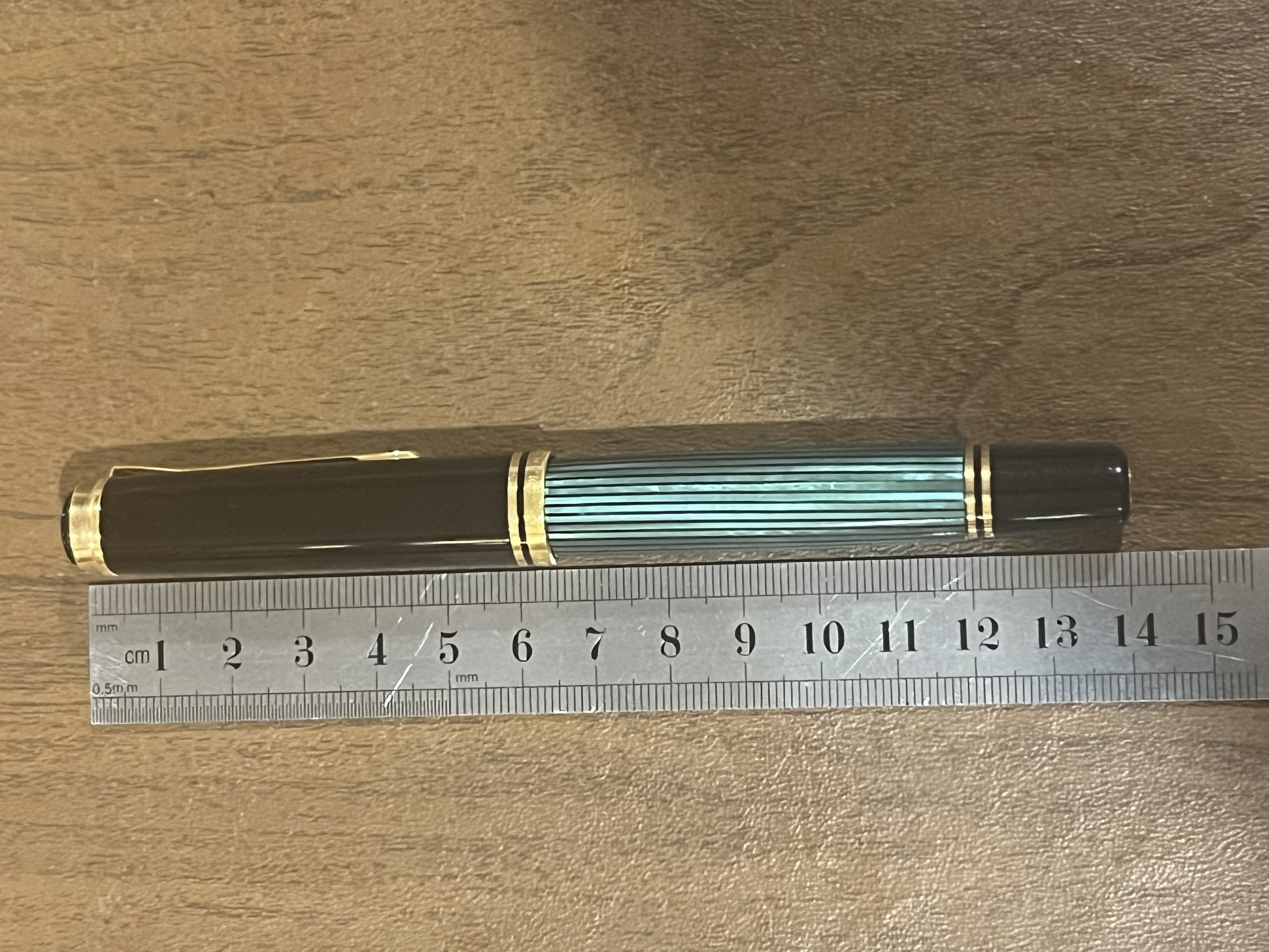 Green striated resin body with gold-filled trim. 14C-585 medium gold nib, made in Germany.