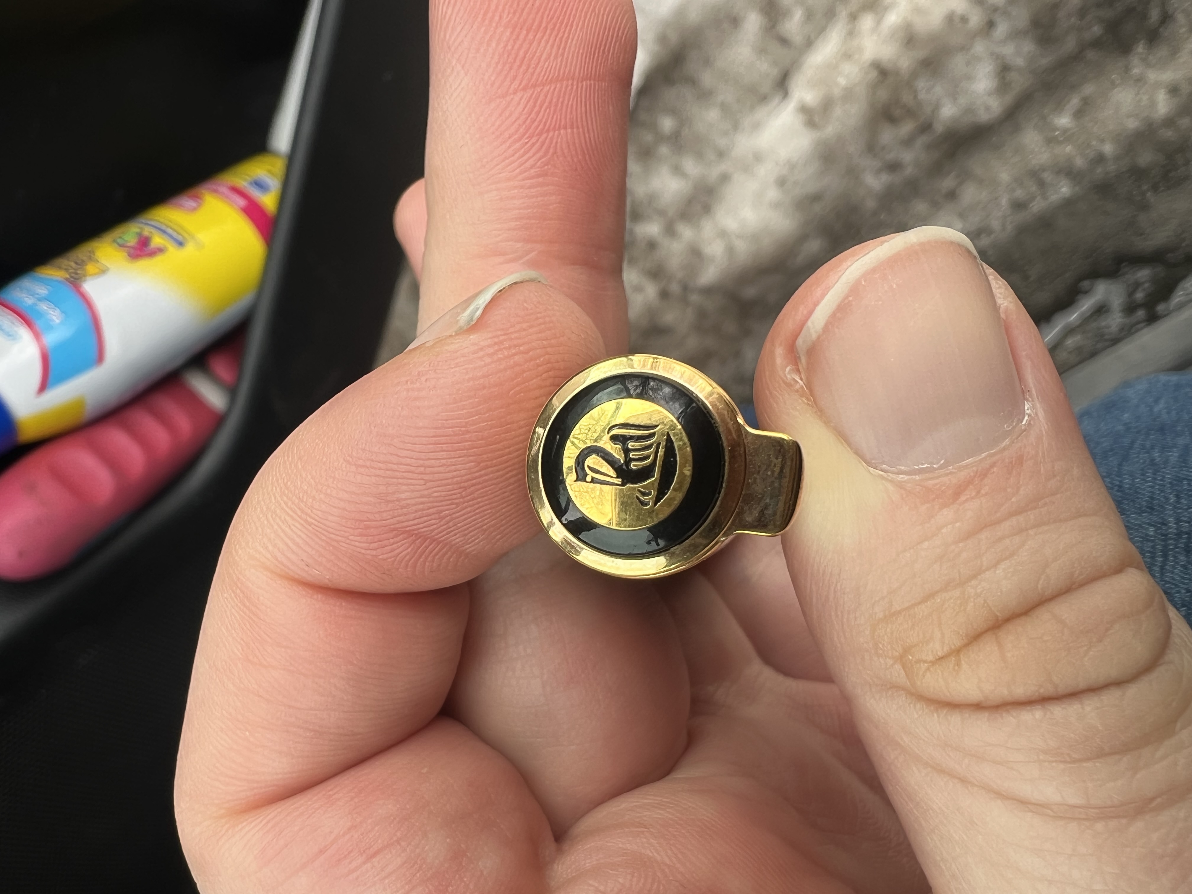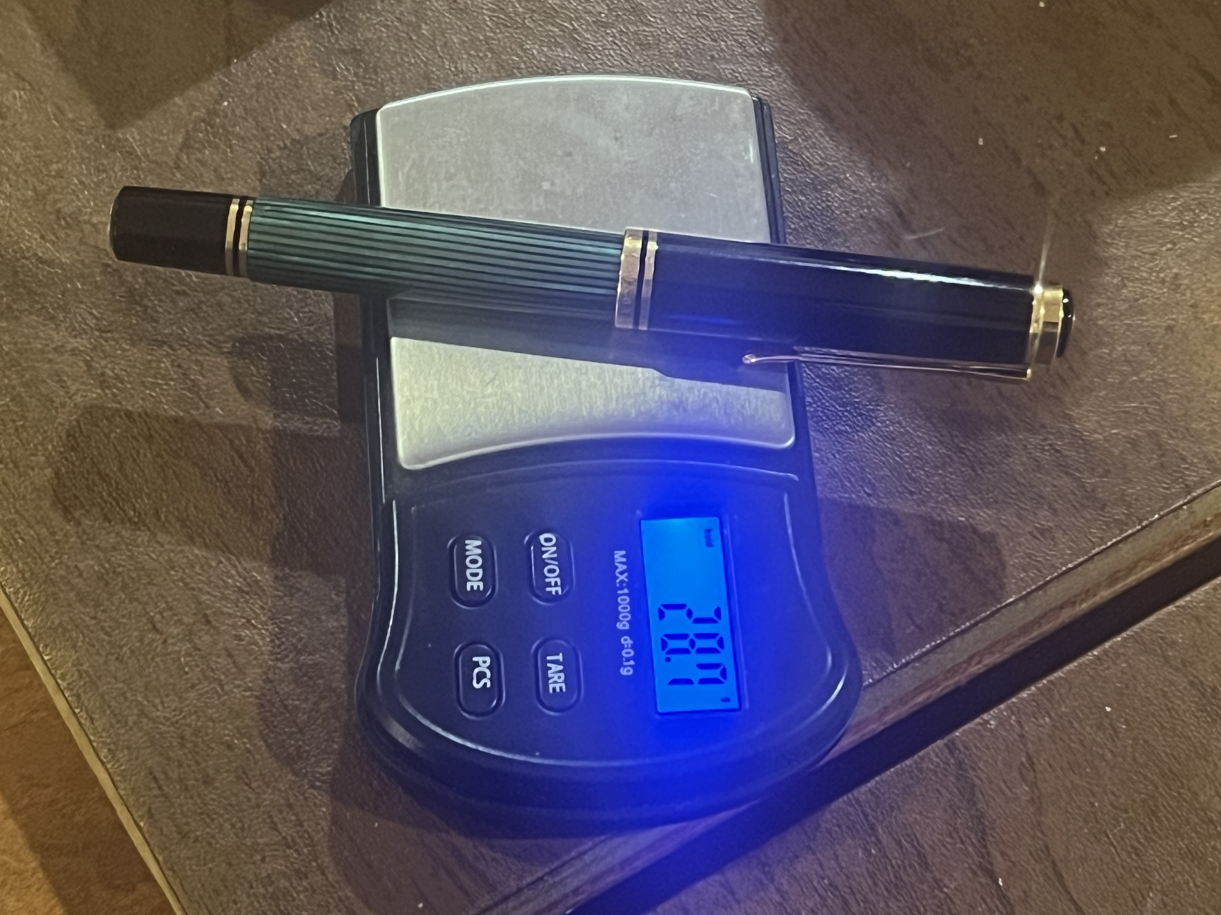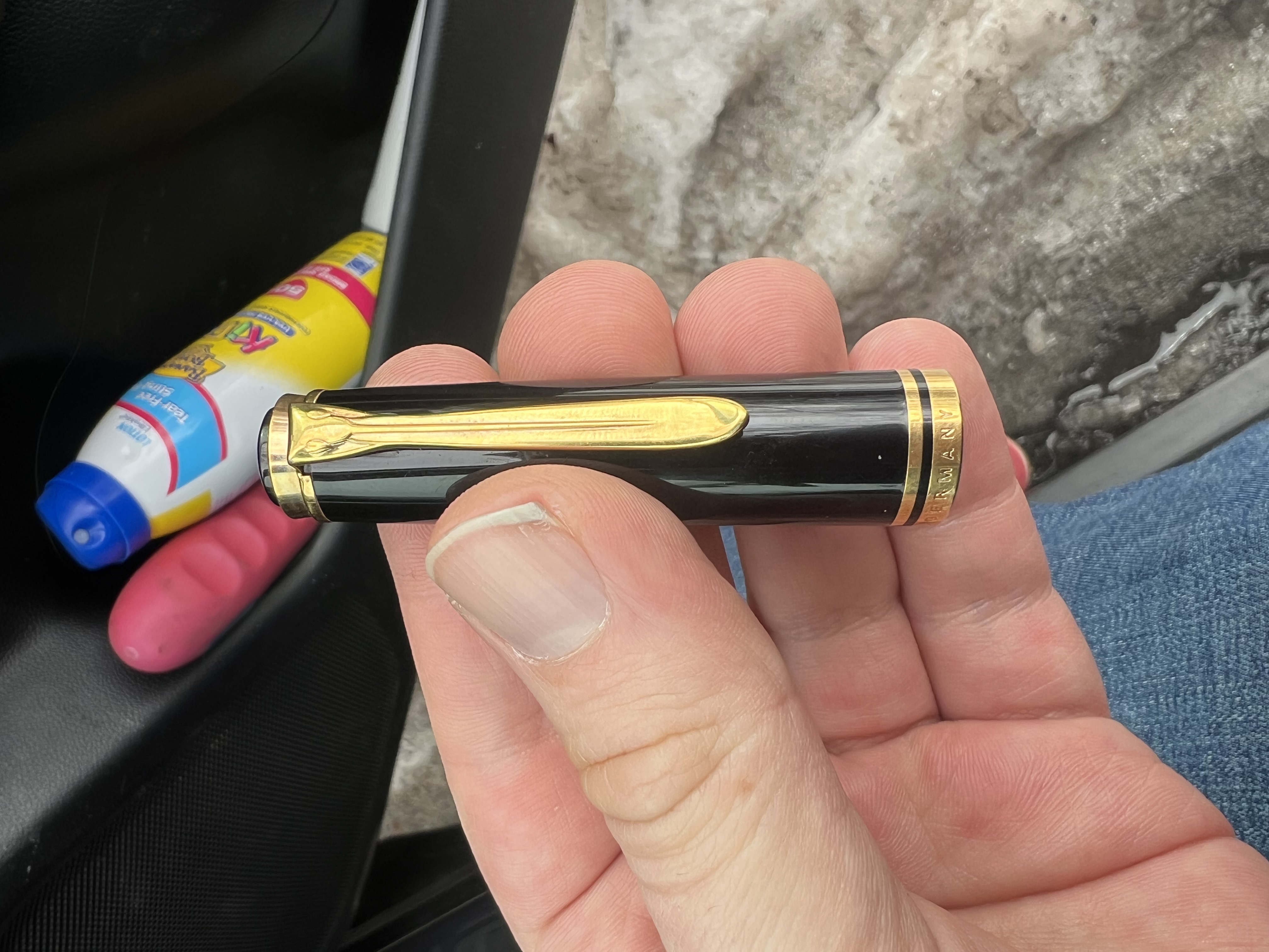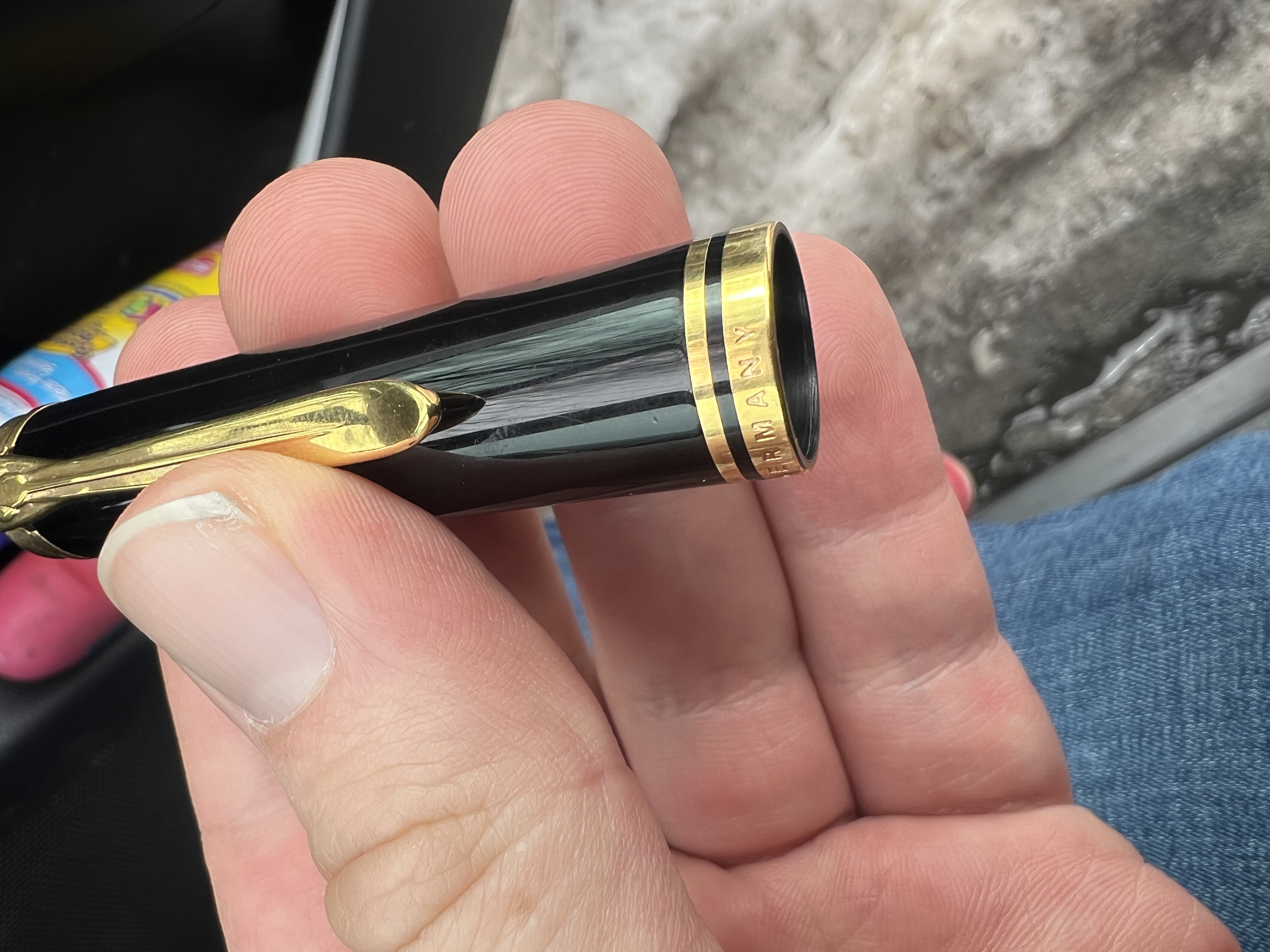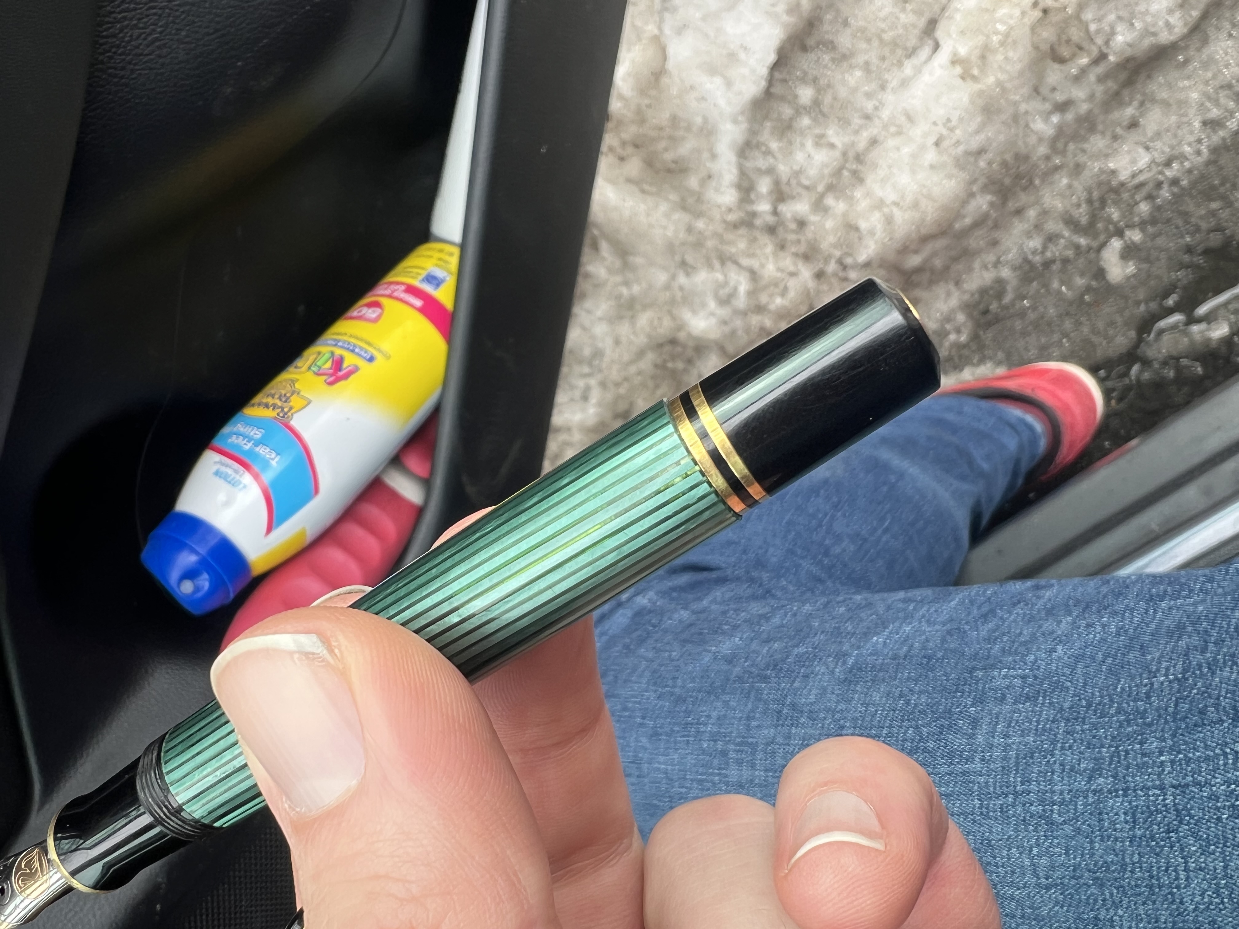 Green striated resin body with gold-filled trim. 14C-585 medium gold nib, made in Germany.